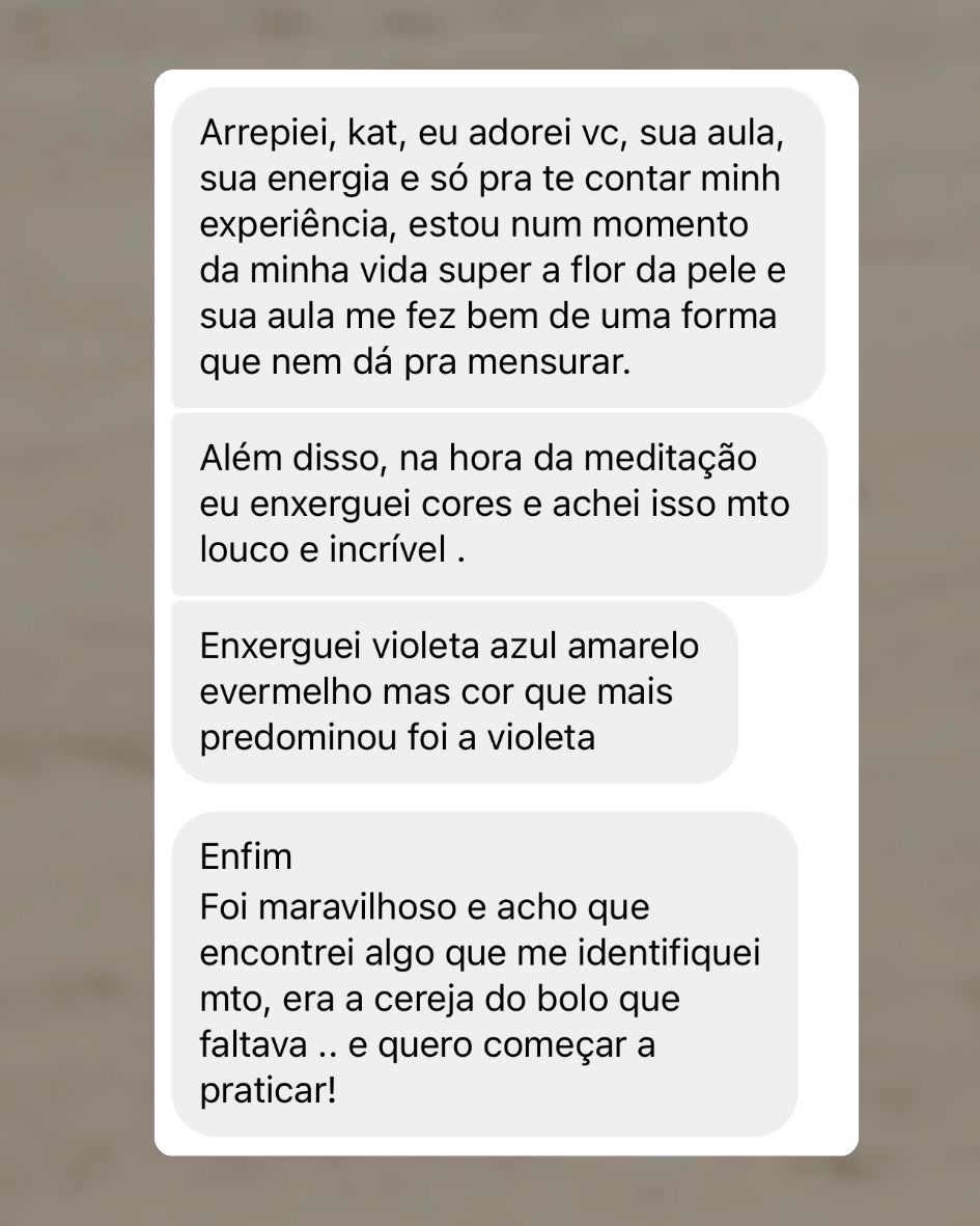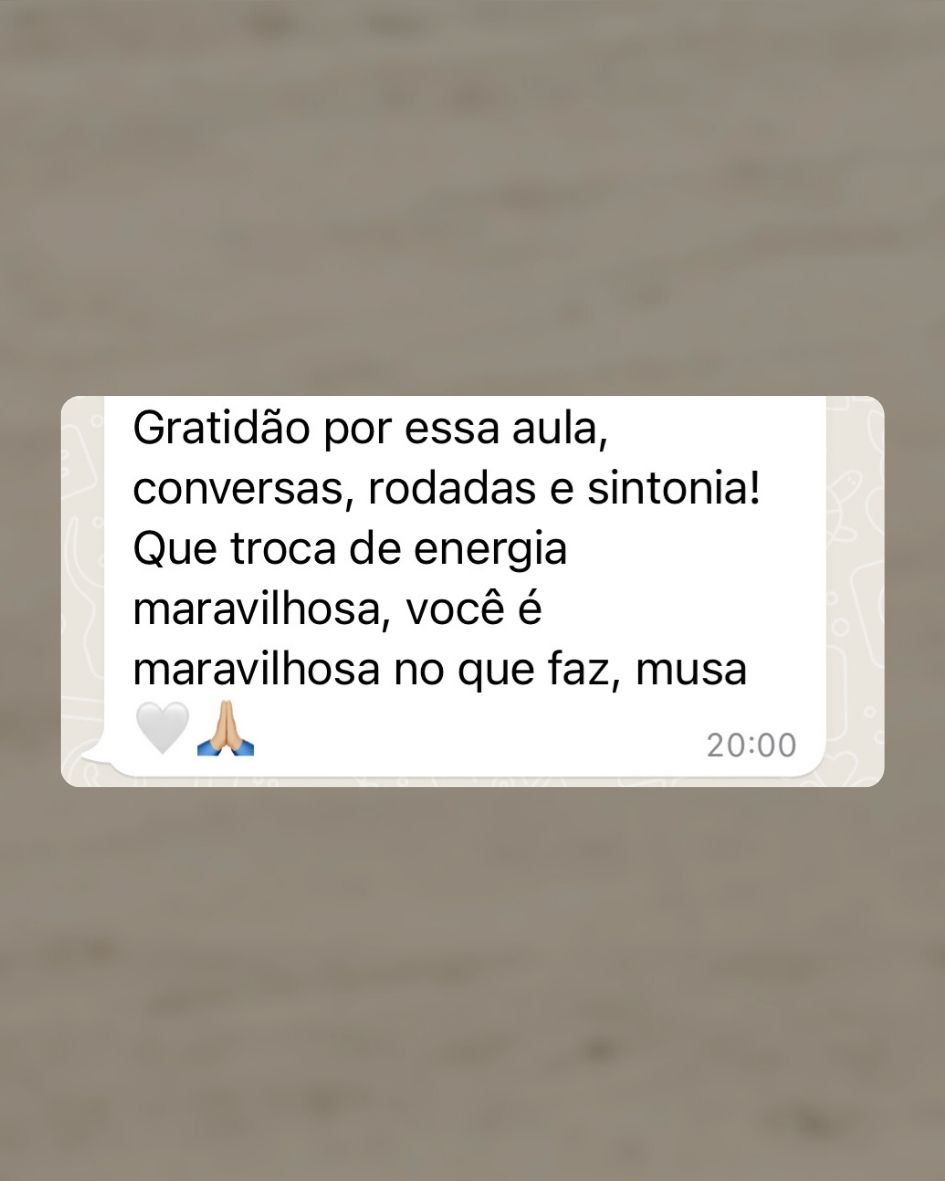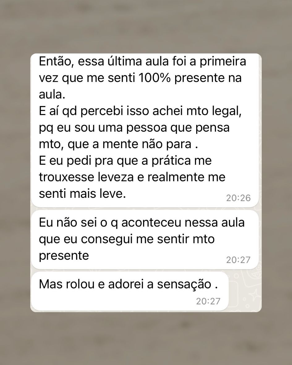 Ao longo do tempo fui recebendo as bençãos de diversos estilos de Yoga e compondo práticas que variam de acordo com o que sinto e vejo que precisa ser trabalhado. Minha formação primária é Hatha Yoga, seguida de influências do Vinyasa, Iyengar e Yin Yoga.